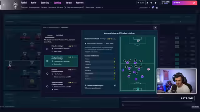 02:42:18Die Anfangsphase von FM26 erfordert viel Lernen und Anpassung an das neue UI. Der Streamer findet den Taktik-Modus sehr spaßig, auch wenn es noch Bugs und Ruckler gibt. Tim Kleindienst ist in der Reha. Julian Korb fehlt im Kader, was ein Bug scheint. Der Streamer speichert die Taktik als 'BMG 2025 neu'. Es werden taktische Feinheiten für jeden Spieler besprochen, wie z.B. seltenere Dribbeln, Pressing und Passrisiko.