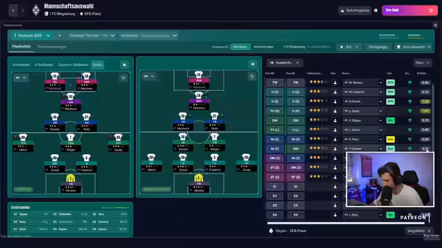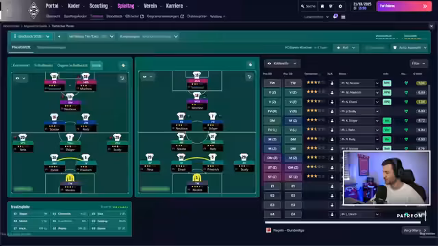 03:25:07Gegen den Tabellenzweiten Union Berlin im Testspiel gerät die eigene Mannschaft ins Hintertreffen, wird aber nach einer taktischen Umstellung mit einem Unentschieden zufrieden. Das folgende Pflichtspiel gegen den FC Bayern München wird als Derby und als Pokalspiel ausgemacht. Der Streamer analysiert die Munich-Formation, sieht sich selbst als die bessere Mannschaft, kritisiert aber die individuelle Klasse der Gegner. Nach einem kämpferischen 1:1 durch Florian Neuhaus, das als völlig verdient gilt, ist der Streamer stolz auf seine Spieler, sieht aber die Chance, das Spiel eigentlich gewinnen zu müssen.