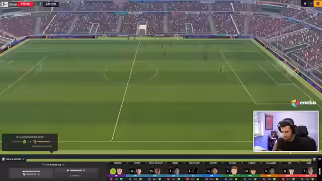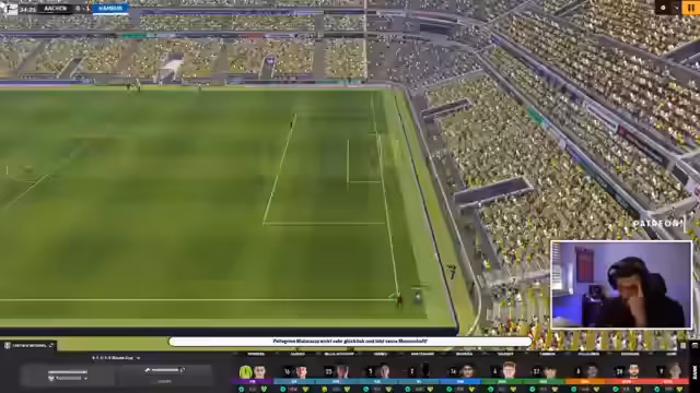 00:24:49Die Stream beginnt mit der Football-Manager-Partie gegen den FC Bayern München. Schon nach 27 Sekunden erzielt die virtuelle Mannschaft Führung durch ein frühes Tor, was im Chat für Aufregung sorgt. Das Spielverhalten wird analysiert und eine tiefe Defensivreihe als Erfolgsfaktor identifiziert. Der Streamer berichtet über personelle Wechsel und Verletzungen, während die virtuelle Alemannia Aachen das Spiel gegen die Bayern mit 2:0 gewinnt und sich so in der Tabelle nach vorne spielt.