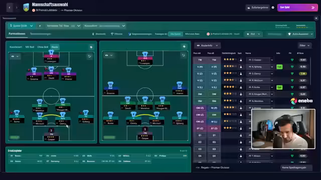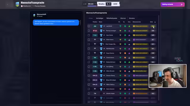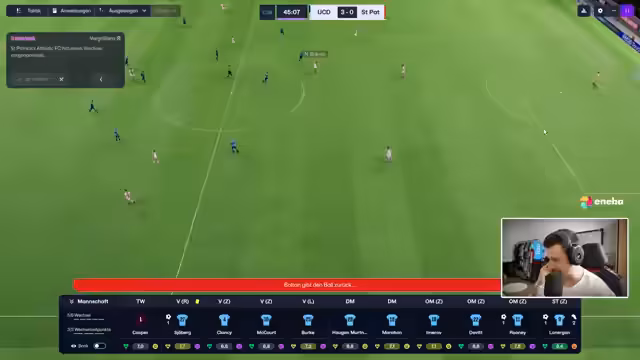 02:36:03Aufgrund einer Sperre eines Spielers, für die Einspruch eingelegt wurde, werden taktische Änderungen und personelle Umbesetzungen für das anstehende Spiel geplant. So soll ein sogenannter Broder eventuell von Beginn an spielen. In einem Spiel gegen Shelburne findet man sich trotz guter Heimstärke in einem Auswärtsspiel wieder und gerät in Rückstand. Der Streamer schildert den Spielverlauf, nutzt die Gelegenheit, um kurz auf andere aktuelle Ergebnisse zu blicken und zeigt Unzufriedenheit über die anfängliche Offensivschwäche. Die Taktik wird an die Gegebenheiten angepasst, um die tabellarische Spitze, die man als Aufsteiger anpeilt, zu erreichen.