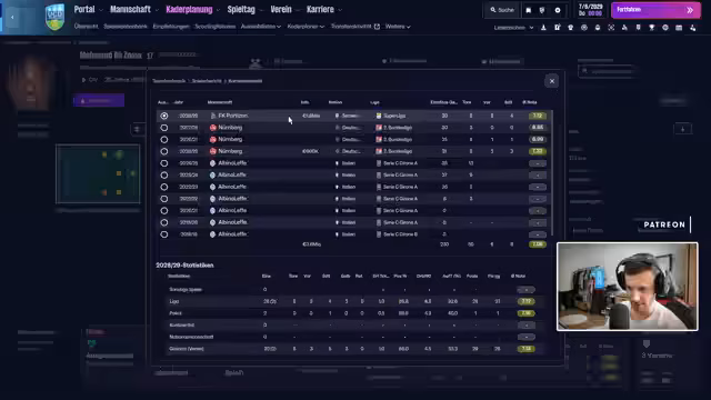 02:34:56Nachdem man die Entwicklung anderer Ligen betrachtet hat, richtet sich der Fokus auf den eigenen Spielbetrieb. Der Streamer erwähnt, dass der Großteil der Zeit damit verbracht wird, die Spiele nacheinander abzuarbeiten und vereinsinternes Scouting vorzunehmen. Man testet Stürmer auf Probebasis und diskutiert deren Verbleib, wobei Spieler wie Sasak Karlajcic und Mirko Franchi als interessant, aber zu teuer oder nicht passend angesehen werden. Die euphorische Stimmung nach dem Aufstieg in die erste Liga und das positive Verhältnis zwischen Team und Fans werden betont.