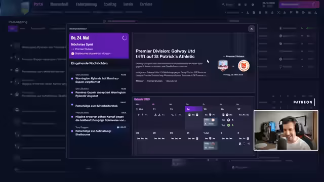 00:12:33Der Stream beginnt am Donnerstagmorgen, den 19.02.2026, um 10:13 Uhr mit einer Begrüßung der Zuschauer und einem Hinweis auf den Inhalt des Streams. Der Streamer begrüßt namentlich mehrere Chatter und erwähnt den Gast im MDR-Studio. Zudem wird eine anstehende Prüfung für einen Zuschauer namens Tantien Iltis thematisiert, für den Daumen gedrückt wird. Der Fokus liegt auf dem bevorstehenden Spiel gegen St. Patrick's Athletic im Football Manager.