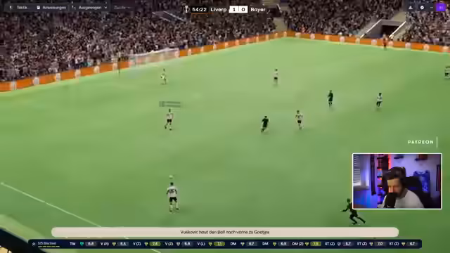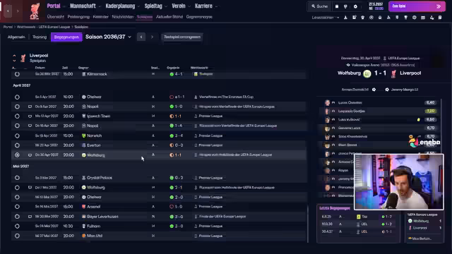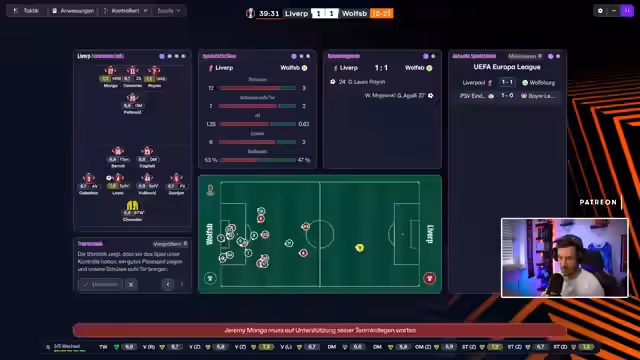 00:49:43Der Streamer startet das entscheidende Europa-League-Halbfinal-Rückspiel gegen Wolfsburg und betont seine Hoffnung auf ein Finaleinzug. Das Spiel beginnt bei 9 Grad an der Anfield Road. Er beschreibt die Spielzüge und Situationen: nach 20 Minuten steht es 0-0, aber nach 30 Minuten schießt Leoni das 1-0. Wolfsburg gleicht in der 37. Minute durch Petkovics Freistoß zum 1-1 aus. Nach der Pause wechselt der Streamer um, bringt Rebannik, der das 2-1 schießt. Leverkusen führt nach einem 2-2 gegen Eindhoven und steht im Finale. Ein weiteres Tor von Petkovic nach einem Freistoß bringt die Entscheidung und den Einzug ins Finale.