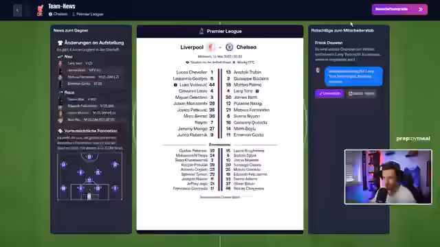 01:24:42Ein entscheidendes Spiel steht an, mit dem die Meisterschaft zu 99% perfekt gemacht werden könnte. Der Streamer plant eineRotation der Mannschaft, um für das Finale gegen Leverkusen fit zu sein. Es wird die Taktik besprochen und die Aufstellung erörtert. Gleichzeitig werden die Gegner Chelsea und Arsenal analysiert und mögliche Wechsel in Betracht gezogen.