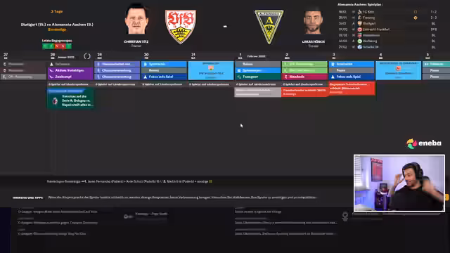 01:39:11Aufgrund von personellen Engpässen, verursacht durch olympische Abstellungen und Verletzungen, muss der Streamer seinen Kader für das Spiel gegen Frankfurt umstellen. Er weist darauf hin, dass Argentinien und Kolumbianer erst am 23.01. zurückkehren und möchte eventuell den Spieler Emily in die erste Mannschaft hochziehen. Er kündigt an, in den nächsten Spielen die Führungskraft Plakern einzusetzen, jedoch nur für 45 Minuten, um ihn nicht zu gefährden. Das Ziel ist ein Sieg in der Champions-League-Qualifikation.