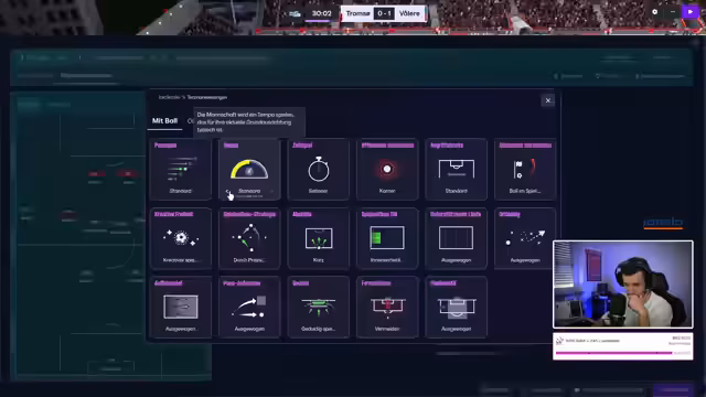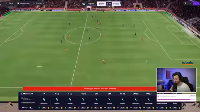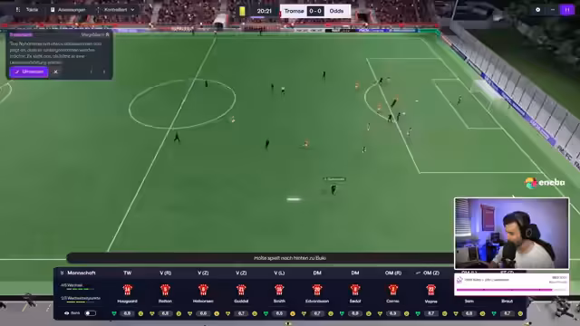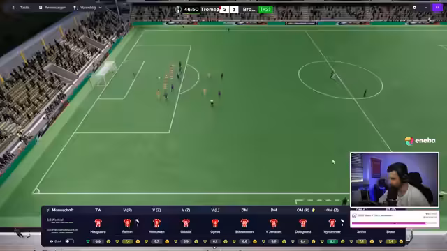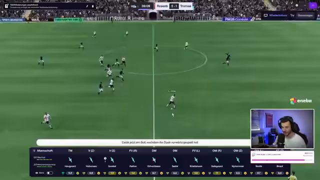 02:15:30Das Ligaspiel gegen Rosenborg beginnt. Tromsø spielt in Schwarz-Türkis. Die Mannschaft hat Schwierigkeiten, ins Spiel zu finden und gerät früh in Rückstand durch Quadwo Dua, einen ehemaligen Spieler von Klobberer. Die Abwehr steht nicht gut, und es gibt Probleme in der Liga. Trotz guter Flanken und Chancen, wie von Braut, gelingt es nicht, den Ausgleich zu erzielen. Der Streamer kritisiert das ungenaue Passspiel und das Gebolze der Mannschaft. Die Spieler wirken verunsichert, und die taktischen Anpassungen scheinen noch nicht vollständig zu greifen. Ein Tor nach einem Standard durch Tobias Gudal bringt den Ausgleich, was die Stimmung kurzzeitig hebt. Das Scouting nach Wunderkindern wird im Chat diskutiert, wobei der Streamer darauf hinweist, dass sein Scouting sich aktuell auf Nordeuropa und hauptsächlich Norweger beschränkt. Trotzdem bleibt das Spiel schwierig, und Rosenborg nutzt die Fehler eiskalt aus. Der Streamer versucht, durch weitere taktische Änderungen, wie das Zurückziehen eines Sechsers, die Defensive zu stabilisieren. Ruben Christiansen, ein erfahrener Spieler, erzielt ein wichtiges Tor, das aber nicht ausreicht, um in Führung zu gehen.