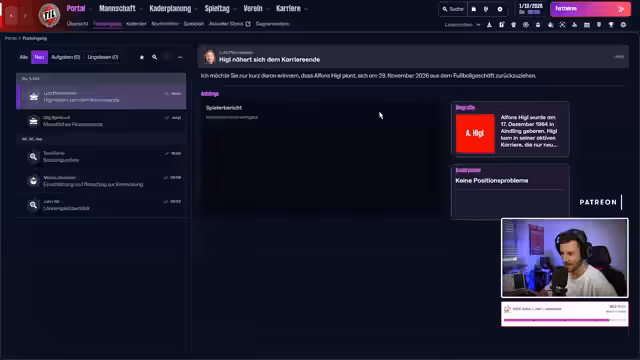01:41:21Nach einer kurzen Kaffeepause kehrt der Streamer zurück und widmet sich der taktischen Vorbereitung auf das nächste Spiel. Es wird überlegt, wie die Mannschaft am besten aufgestellt werden kann, insbesondere im Hinblick auf die Verletzungen und die anstehenden wichtigen Partien. Der Führende der Torschützenliste, Hummelvoll Nunez, wird erwähnt. Die Diskussion im Chat dreht sich um Weihnachtswünsche, wobei Gesundheit, Weltfrieden und Ruhe als häufigste Wünsche genannt werden. Der Streamer betont, dass man in einem Alter ist, in dem man sich Dinge entweder selbst kauft oder nicht. Es wird auch über die Rückkehr des Kollegen Schnürschuh gesprochen, der noch sechs Tage bis zwei Wochen ausfällt. Die Aufstellung wird angepasst, wobei Edwardson, Wappen und Christiansen wichtige Rollen spielen. Es wird ein Angebot für den 20-jährigen Linksfuß Casten abgegeben, der trotz hoher Kosten und der Position als Topverdiener des Teams als vielversprechende Verstärkung angesehen wird. Die Verträge von Söder und Smith werden verlängert, um wichtige Spieler langfristig an den Verein zu binden. Der Streamer plant, bis 14 Uhr live zu sein und später am Tag einen weiteren Stream zu veranstalten, dessen genaue Inhalte (FM, Anno oder beides) noch offen sind.