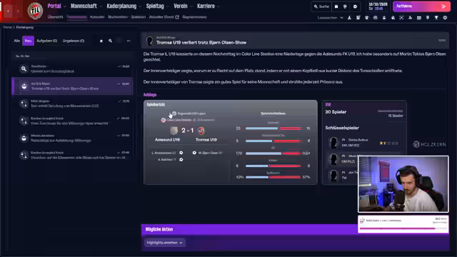 00:28:10Der Streamer thematisiert das Problem der Matchpraxis für Bankspieler und die Notwendigkeit, sie häufiger in der zweiten Mannschaft einzusetzen, anstatt Testspiele zu arrangieren, was er als unrealistisch empfindet. Es wird die Frage aufgeworfen, ob man Spieler für die zweite Mannschaft abstellen kann, was bejaht wird. Die Zuschauer tauschen sich über ihre FM-Erfahrungen aus, darunter Erfolge mit goldenen Generationen und Torschützenkönigen. Es wird auch die Idee diskutiert, ehemalige norwegische Topspieler wie Haaland oder Ødegaard zurückzuholen, um sie als Jugendabteilungsleiter oder Trainer einzusetzen. Im Spiel gegen Brandenbergen gerät Tromsö IL in Rückstand, was zu einer Diskussion über die Aussprache von Spielernamen führt. Der Streamer zeigt sich enttäuscht über den Spielverlauf und überlegt, in der Halbzeit Änderungen vorzunehmen. Trotz eines zwischenzeitlichen Anschlusstreffers kann Tromsö IL das Spiel nicht mehr drehen. Nach dem Spiel wird ein Blick auf die Tabelle geworfen, wobei Tromsö IL aktuell Vierter ist und sich für die Qualifikation zur Conference League qualifiziert hat, was als großer Erfolg gefeiert wird. Es werden aktuelle Bilder und Videos aus Tromsö gezeigt, die die winterliche Landschaft und den neuen Shop im Stadtzentrum präsentieren. Der Streamer teilt auch mit, dass er bei Tromsö IL bleiben möchte und einen 'One-Club-Safe' anstrebt, jedoch offen für eine weitere FM-Journey ist.
