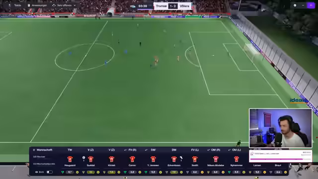 01:29:33Im weiteren Verlauf des Spiels gegen Renga werden weitere taktische Anpassungen vorgenommen, um den Druck zu erhöhen. Nielsen Modebe wird als inverser Außenstürmer eingesetzt, und Larsen kommt für Dalsgaard ins Spiel, da er im letzten Match als Joker gut performte. Wappner wird durch Nyhammer ersetzt, und Kornig kommt für Dahlreit. Trotz vieler Bemühungen und guter Chancen, darunter ein Tor des 17-jährigen Larsen, gelingt es der Mannschaft nicht, in Führung zu gehen. Die Schlussphase ist von hohem Risiko geprägt, um den Sieg zu erzwingen. Trotz dominanter Spielweise und zahlreicher Angriffe kassiert Tromsø in der 90. Minute das entscheidende Gegentor zum 2:1. Diese Niederlage wird als besonders bitter empfunden, da das Team im zweiten Durchgang kaum etwas zugelassen hatte. Der Streamer kündigt eine kurze Pause an, um Kaffee zu holen und sich auf das nächste Spiel im Brothenl Cup gegen eine unterklassige Mannschaft vorzubereiten, wo möglicherweise ein Zwei-Stürmer-System getestet werden soll, um wieder erfolgreicher zu werden. Eine kostenlose Demo des Spiels wird erwähnt, die Interessenten ausprobieren könnten.