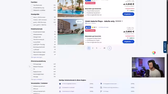 02:48:48Der Streamer beginnt, intensiv über einen Mallorca-Urlaub nachzudenken. Nachdem er eine Website aufruft, filtert er nach zweiwöchigen Reisen für zwei Personen mit einem Budget von 8.000 Euro pro Person. Es werden verschiedene Optionen wie Hotel- oder Ferienhausunterkünfte, verschiedene Sternekategorien und ein Fokus auf Erwachsenenhotels und hohe Bewertungen durchgespielt. Er betont, dass er einen Raucherbereich benötigt und sich über steigende Preise bei Pauschalreisen beklagt.