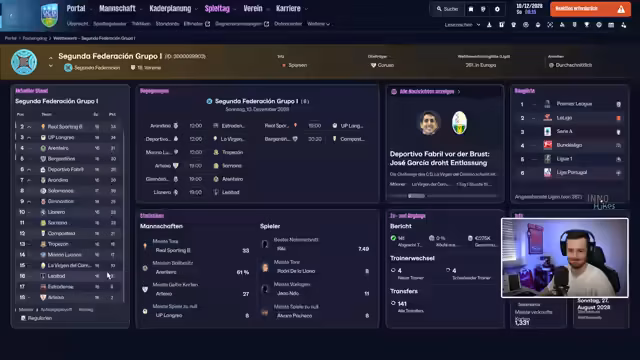 02:46:06Zunächst wird der Neuzugang des spanischen Spielers Voldemar präsentiert, ein 2 Meter großer Spieler mit exzellenten Werten im Dribbling und Abschluss, für den 15 Millionen Pfund bezahlt wurden. Der Streamer unterhält sich humorvoll über die Notwendigkeit von Arbeitszeitbetrug im eigenen Management und konstatiert, dass sich alle Probespieler im Kader befinden. Zudem erwähnt er seinen anstehenden Urlaub, der voraussichtlich vom 16. bis zum 28. Juni stattfinden wird.