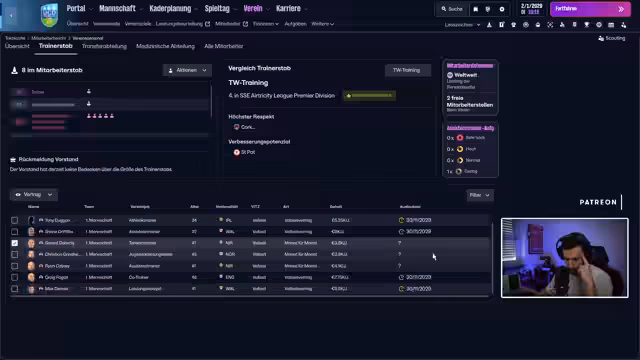 01:40:07Ein umfassender Neuaufbau des Personals beginnt. Alte Verträge von Mitarbeitern werden nicht verlängert. Es werden neue Positionen besetzt: Ein Jugendabteilungsleiter, ein Chefscout und ein Athletiktrainer werden eingestellt. Beim Kader werden Transferziele verfolgt, wobei das Budget und Gehälter im Fokus stehen. Spieler wie Harry Grew werden als nicht marktfähig eingestuft.