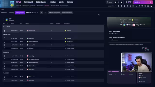 01:32:53Die letzte Bewerbungsphase startet. Am 31. Dezember wird festgestellt, dass kein besseres Angebot als der Verbleib bei UCD vorliegt. Eine neue Verhandlung über den Kompensationsprozentsatz wird eingeleitet, wobei niedrig gewählt wird, um die Übernahme durch einen neuen Verein zu erleichtern. Ein neuer Vertrag mit einem Jahr Laufzeit wird unterschrieben, was den Verbleib in der irischen Liga für die nächste Saison sichert.
