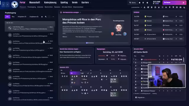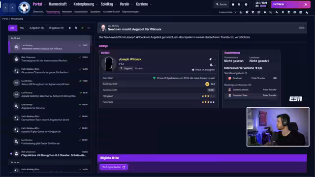 00:16:39Der Streamer stellt den neuen Verein, Airbus UK Broughton FC, vor. Der Verein befindet sich in Wales, nahe Liverpool, und sein Stadion heißt Airfield. Das Maskottchen ist Garfield und das Wappen zeigt einen Airbus A380. Der Kader ist momentan dünn und der Streamer setzt auf eine Transferpolitik, die auf ablösefreie Spieler und Probetrainings setzt. Manuela und Chris Weber werden auf der Suche nach Verstärkung betrachtet, während ein Torhüter mit einer ablehnenden Arbeitserlaubnis problematisiert wird.