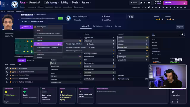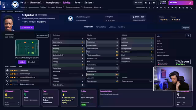 00:25:44Der Streamer erklärt seine Transferstrategie: Er will keine Ablösen zahlen und konzentriert sich auf Spieler aus Probetrainings. Das Ziel ist es, für jede Position im System einen Stammspieler, einen Rotations- und einen Schlüsselspieler zu finden. Die ersten Transfererfolge werden verkündet. Der Linksaußen Luke O'Brien wurde verpflichtet und der Linksverteidiger CJ Nyakuwa ist für vier Wochen zum Probetraining eingeladen. Am Ende des Testspiels gegen Kersus feiert die Mannschaft einen 3:0-Sieg.