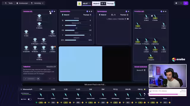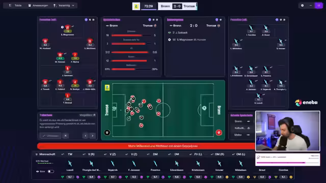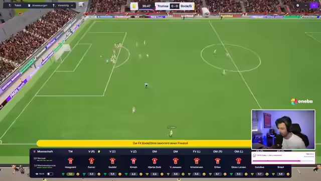 00:53:37Das erste offizielle Spiel des Saves gegen Brandenbergen wird live kommentiert. Trotz einer defensiven Umstellung auf zwei Stürmer und Flügelspiel verliert Tromsø IL mit 2:5. Der Streamer ist mit der Leistung, insbesondere der hohen Anzahl von Gegentoren in dieser Saison, unzufrieden. Trotzdem ist er für die nächste Partie, das Pokalspiel gegen Bodo Glimt, motiviert.