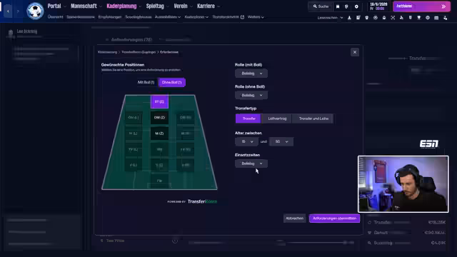 02:57:38Der Streamer nutzt das Tool Transferroom, um Spieler zu scouten und Anfragen zu stellen. Da das Budget begrenzt ist, konzentriert man sich auf ablösefreie Spieler. Für jede Position werden drei Aufträge mit unterschiedlichen Einsatzzeiten (Rotation, Stamm, Schlüsselspieler) erstellt, um eine breite Auswahl zu bekommen. Es zeigt sich, dass der Scouting-Prozess aufwendig ist und nicht alle gewünschten Spieler verfügbar sind oder ihre Gehaltsforderungen zu hoch sind.