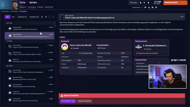 00:44:00Nachdem der Trainerposten bei Warren Point Town geklärt ist, beginnt der Bewerbungsprozess auf dem Arbeitsmarkt. Der Streamer bewirbt sich bei zahlreichen Vereinen in verschiedenen Ligen, darunter auch im Ausland. Die Suche gestaltet sich jedoch schwierig, und erste Bewerbungen bei Slavia Sofia oder Brügge B bleiben erfolglos. Das primäre Ziel ist es, einen Verein zu finden, der die Erlangung eines Trainerpatens ermöglicht.