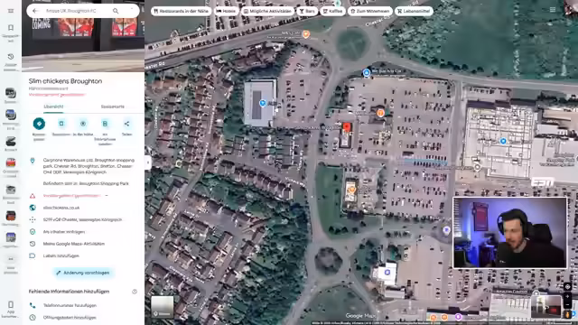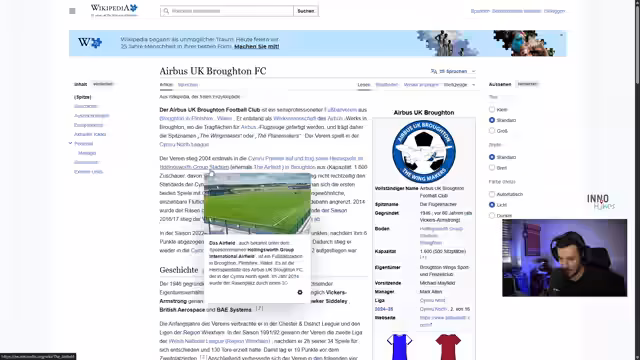 01:52:05Nach einer Kaffeepause präsentiert der Streamer den neuen Verein Airbus UK Broughton. Es wird der Stadion Hollingsworth Group Stadium gezeigt, der direkt am Flugzeugwerk liegt. Der Verein, gegründet 1946 als Werksmannschaft, hat den Spitznamen 'The Wingmakers'. Es gibt einen Fanshop und Sponsoring-Möglichkeiten. Nach einer kurzen Recherche auf Google Maps wird die Lage des Stadions in Broughton, North Wales, vorgestellt, mit Einkaufsmöglichkeiten in der Nähe.