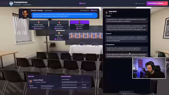 02:19:26Der Streamer gibt sich als neuer Trainer von Airbus UK Broughton und beantwortet Fragen in einer angenommenen Pressekonferenz. Er äußert seine Freude über die neue Chance und betont, dass es nichts zu bedauern gibt. Sein Fokus liegt darauf, das bestmögliche aus dem Kader herauszuholen. Es werden zukünftige Ziele wie ein möglicher Co-Trainer im weiteren Verlauf der Journey angesprochen, der ebenfalls ausgebildet werden könnte.