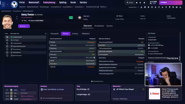 02:12:19Der Streamer verkündet, den Vertrag bei Airbus unterschrieben zu haben und präsentiert die ersten Ziele für den Verein. Das Hauptziel ist der Aufstieg aus der aktuellen walisischen Liga. Ein wichtiger Punkt ist die Erlangung der nationalen C-Trainerschein-Lizenz. Gleichzeitig wird die Kaderstärke analysiert und festgestellt, dass die Mannschaft ähnlich stark wie der vorherige Verein ist. Die Herausforderung, aus dem 'Schwemmehaufen' ein erfolgreiches Team zu formen, wird thematisiert.
