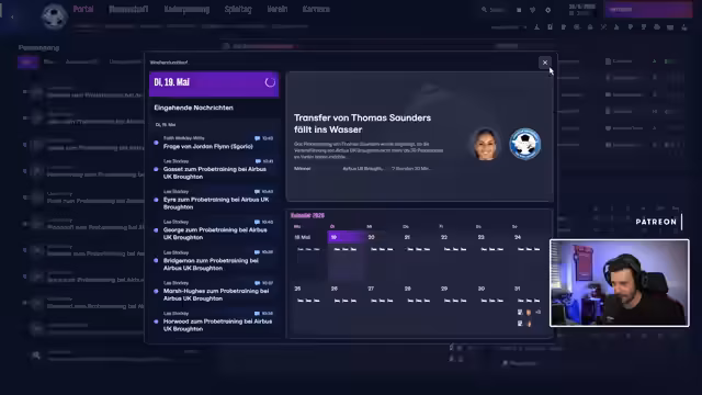 01:01:15Der Streamer beendet seine Zeit bei Warren Point Town mit einem Rücktritt, da der Verein ihm keinen Trainerschein garantieren kann. Im Arbeitsamt wird eine neue Bewerbung für alle offenen Positionen gestartet. Ein erfolgreiches Gespräch findet bei Airbus UK Broughton in Wales statt, einem Verein aus der zweiten walisischen Liga, der ambitioniert ist und den Streamer anstellt.