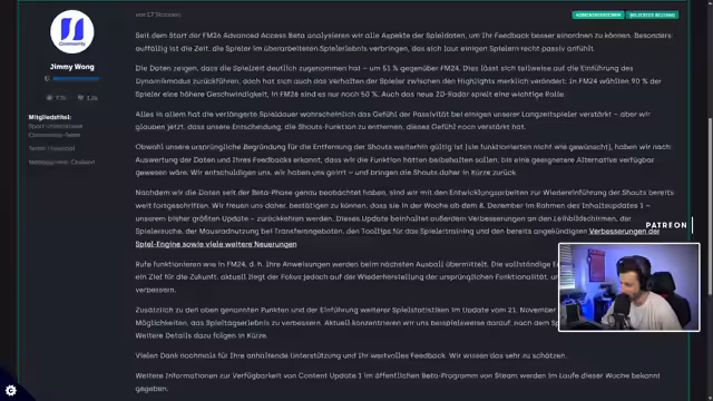 00:12:30Der Stream startet an einem Dienstagmorgen mit traditionellem Kaffee und gutem Humor. Der Hauptfokus liegt auf dem FM26, inklusive wichtiger Update-News. Ein zentrales Thema ist die Rückkehr der sogenannten "Shouts" (Rufe), welche vorübergehend entfernt wurden. Laut Entwicklerdaten ist dies für die Woche ab dem 8. Dezember im größten Update geplant, um das Spieltagserleben zu verbessern.