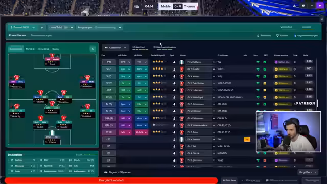 04:24:20Vor dem Auswärtsspiel gegen Molde passt der Streamer seine Taktik an. Er stellt auf eine 'ausgewogene' Formation um, um gegen den starken Gegner zu bestehen. Ein wichtiger Neuzugang ist Valle Egele, einer der 'defensiv stärksten Verteidiger' der letzten Saison. Das Spiel selbst verläuft erfolgreich, das Team führt und der Torwart Njai pariert einen Elfmeter. Der Streamer ist mit dem bisherigen Saisonverlauf und dem Tabellenführerstatus sehr zufrieden.