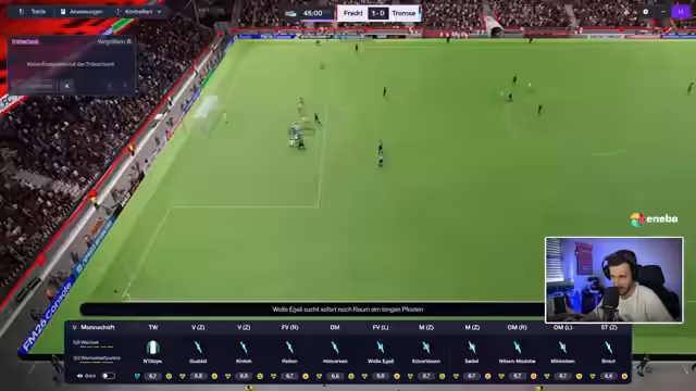 03:59:19Es geht ins nächste Spiel gegen Hamkam, ein angesetztes Topspiel. Der Streamer nennt einen jungen Rechtsverteidiger von Hamkam, David de Ornelas, einen 'Wunderknaben' und perspektivischen Transferkandidaten. Das Spiel beginnt, und die Heimmannschaft dominiert früh das Spielgeschehen, erarbeitet sich aber noch keine klaren Torchancen. Die neuen Taktikeinstellungen für Einwürfe und Ecken werden angewendet.