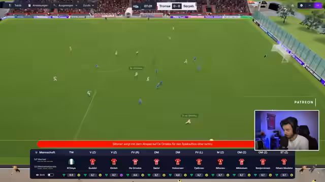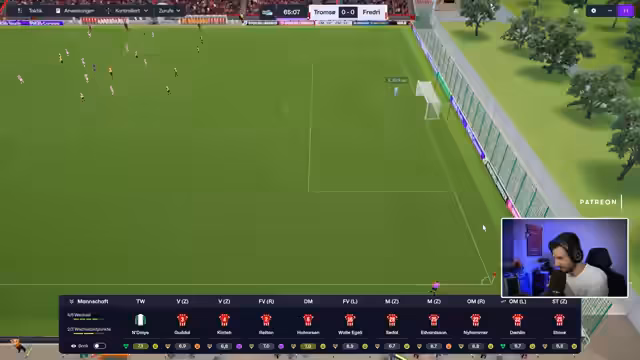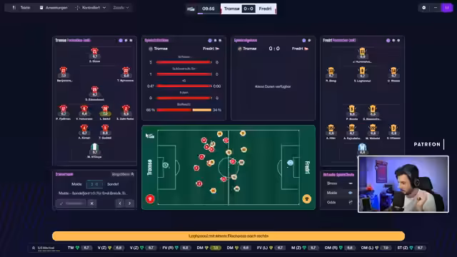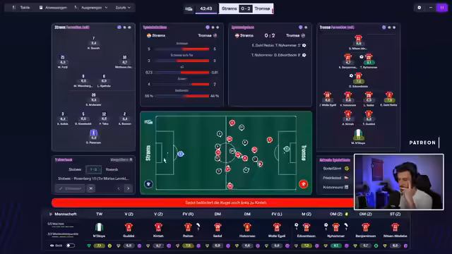 01:27:32Während des Spiels gegen Sarpsborg verletzt sich Kintee kurz vor dem wichtigen Halbfinale gegen Basel, was die Personalsituation weiter verschärft. Es wird über die Kameraperspektive im Spiel diskutiert; der Streamer bevorzugt eine weite Ansicht, um das gesamte Spielfeld zu überblicken, obwohl dies auf kleineren Bildschirmen oder mobilen Geräten schwierig sein kann. Die Heimschwäche des Teams setzt sich fort, mit fünf Halbzeiten in der Romsås Arena ohne eigenes Tor in der Liga. Trotzdem werden Chancen erarbeitet, aber die Umsetzung mangelt. Die Mannschaft muss eine Lösung finden, um die Defensive des Gegners zu überwinden und Fehler im Aufbau zu vermeiden. Die Diskussion über die Heimschwäche und Auswärtsstärke bleibt bestehen, da das Team auswärts weiterhin ungeschlagen ist.