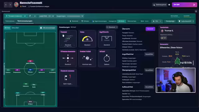 01:50:49Nach der Kaffeepause und dem Download des 1,7 GB großen Updates wird eine detaillierte Analyse der Patchnotes vorgenommen. Es wird festgestellt, dass das Update Verbesserungen an den Berichten nach dem Spiel, der Vertragslogik von Spielern und Mitarbeitern sowie der Spielstabilität enthält. Besonders hervorgehoben werden die verbesserten Halbzeit- und Post-Match-Berichtsbildschirme. Der Streamer teilt den Link zu den Patchnotes im Chat, damit die Zuschauer die Änderungen selbst nachlesen können. Die Vorfreude auf das anstehende Conference League Halbfinale gegen den FC Basel ist groß, und es wird eine Wette für das Hinspiel angeboten. Die Mannschaft bereitet sich auf das wichtigste internationale Spiel ihrer Vereinsgeschichte vor, das aufgrund von UEFA-Regularien in einem Ausweichstadion stattfindet.