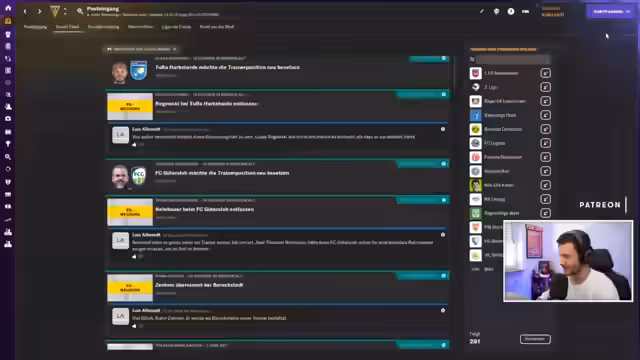00:28:48Im Football Manager steht ein U19-Spiel gegen Gladbach an, das knapp verloren geht. Anschließend wird der Kader für das nächste Profispiel gegen Aachen 92 besprochen. Nach einer Verletzung wird spontan Mike Wels eingewechselt. Das Gespräch dreh sich um die Stammformation, Wechseloptionen und den Kampf um Plätze im Team.