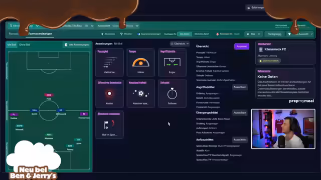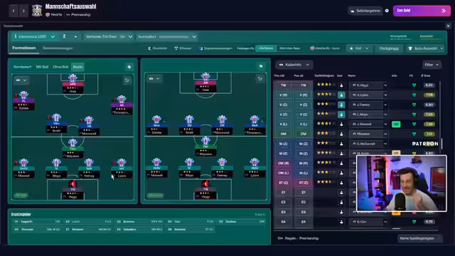 02:22:04Für das Auftaktspiel gegen Hearts of Middlethian wird die Taktik auf ein enges, taktisches Spiel mit Fokus auf Mittelfeldkontrolle und schnelle Konter ausgelegt. Die individuelle Ausrichtung der Spieler wird angepasst; beispielsweise sollen die Außenverteidiger und der Halbraumstürmer häufiger in den gegnerischen Strafraum einrücken. Das Team zeigt im Spiel einen beeindruckenden Ballbesitz und kombiniert attraktiv, scheitert jedoch an der Chancenverwertung. Das Fehlen von Torerfolgen ist trotz spielerischer Überlegenheit ein großes Problem.