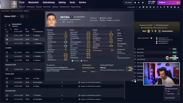 00:32:40Der Streamer wechselt das Thema und spricht über die Weltmeisterschaft 2030, die in Spanien, Portugal und Marokko stattfindet. Die deutsche Nationalmannschaft schied im Viertelfinale gegen England mit 0:2 aus. Im Achtelfinale wurde Brasilien mit 2:0 besiegt. In der Gruppenphase setzte sich Deutschland gegen Mali, Slowenien und Mexiko durch. Bundestrainer ist Sebastian Hoeneß. Der Streamer spekuliert über ein bevorstehendes FM-Update, das die Funktion des Nationaltrainers einführen könnte.