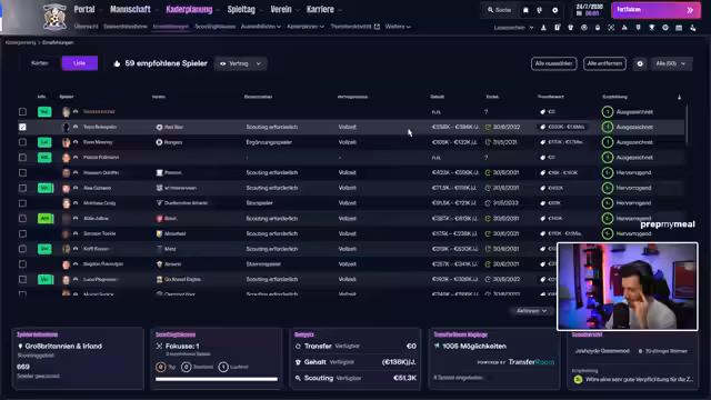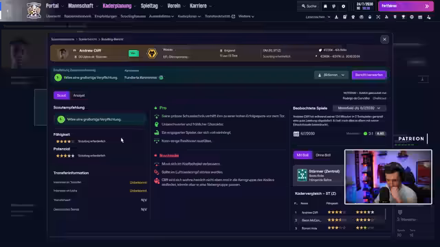 01:09:11Auf der Suche nach einem neuen Innenverteidiger analysiert der Streamer potentielle Kandidaten aus dem Scouting. Er zeigt sich enttäuscht von den Eigenschaften einiger Spieler wie Ryan Kohli, der laut seiner Ansicht nicht die nötige Qualität besitzt. Der Streamer durchforstet das Scouting-System und findet einige Stürmer, die jedoch nicht ins Konzept passen. Auch potentielle Zielspieler wie Andrew Cliff vom Wolves werden geprüft, wobei er sich unsicher ist, ob der Spieler die erwartete Qualität bringt. Die Suche nach einer geeigneten Verstärkung gestaltet sich schwierig.
