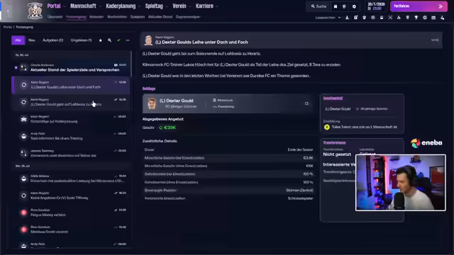 01:01:49Der Streamer beleuchtet die prekäre finanzielle Situation des Klubs, der sich mit 136.000 Pfund im Minus befindet. Um das Budget zu sanieren, werden Thompson und Macmillan für 17,5 bzw. 100.000 Pfund verkauft. Bei der Kaderplanung gibt es eine wichtige Regel: Man darf nur einen Spieler von einem anderen schottischen Verein leihen. Da bereits ein Spieler von Celtic ausgeliehen ist, können keine weiteren schottischen Leihspieler verpflichtet werden. Der Fokus liegt nun auf dem Verkauf von Spielern und dem Finden von kostengünstigen Verstärkungen.