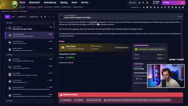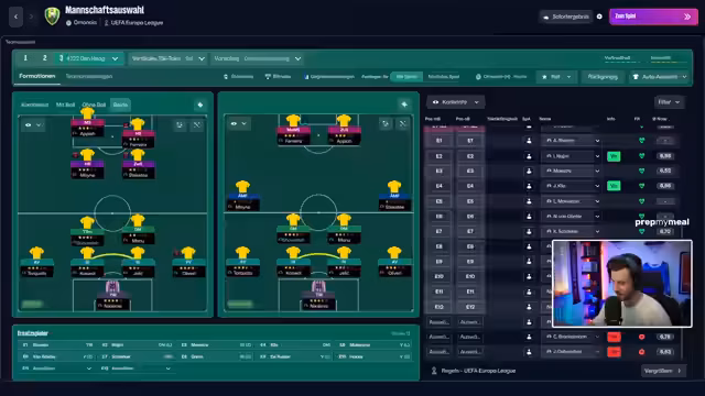 00:51:10Der Streamer wechselt zum nächsten Spiel in der Europa League gegen Alkmaar. Nach einem Taktikwechsel und mehreren personellen Wechseln in der 72. Minute gelingt eine schnelle Führung. Die erste Halbzeit wird als verdient angesehen. Der Streamer zeigt sich optimistisch, den Sieg über die Top-Mannschaft Alkmaar nach Hause zu bringen, um die Moral im Team zu stärken.