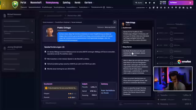 03:36:58Die drohende Entlassung des Trainers wird zum zentralen Thema. Der Druck durch anhaltende Niederlagen und die unzufriedene Vereinsführung steigt. Der Streamer analysiert seine berufliche Zukunft und den Kader im Hinblick auf eine mögliche Neuausrichtung. Er erwägt drastische Maßnahmen wie den Kauf von elf neuen Spielern oder sogar einen Neuaufbau des Teams aus lokalen Kräften, falls der Verein den Klassenerhalt nicht schafft.
