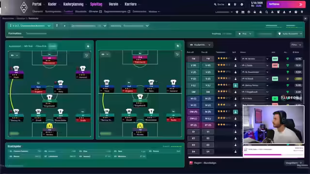 01:12:30Das Testspiel gegen Wuppertal wird simuliert und endet mit einer 1:2-Niederlage. Der Streamer äußert seinen Unmut über die langen Länderspielpausen und zeigt die Transferhistorie des Klubs. Janik Hofmann wurde an Karlsruhe verliehen und Florian Flick zu Braunschweig. Er kündigt weitere Testspiele gegen Klub und Augsburg an und stellt die Aufstellung für das nächste Spiel gegen Wuppertal zusammen, in der er einigen Nachwuchsspielern eine Chance gibt.