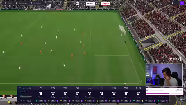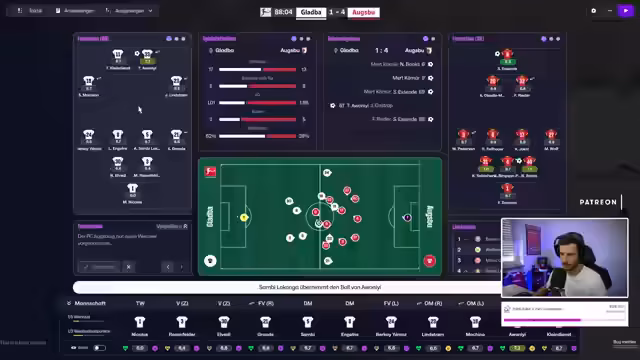 01:51:11In der 62. Minute wird das Spiel durch ein Tor für Gladbach belebt, was Hoffnung auf einen Sieg weckt. Der Streamer erwähnt eine Verbesserung der Grafik durch den 3D-Spielmodus im Vergleich zur Beta-Version. Es werden taktische Wechsel vorgenommen, um das Spiel wieder in den Griff zu bekommen, doch die mangelnde Effektivität im Abschluss bleibt das Hauptproblem.