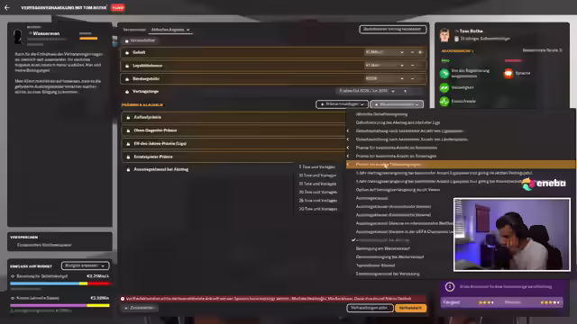 00:39:53Es wird über den potenziellen Transfer von Tom Rote gesprochen, der als großer Steal für 2,6 Millionen angesehen wird. Das Problem ist jedoch sein Gehalt, und es wird überlegt, welche Anreize man ihm bieten kann. Der Streamer schließt aus, Trisoldi zu holen, da er bereits im FCN-Projekt auf YouTube präsent ist. Es wird über eine Prämie für Vorlagen diskutiert. Der Streamer möchte Tom Rote unbedingt verpflichten und überlegt, wie man das finanziell hinkriegt. Es wird über eine mögliche Ausstiegsklausel diskutiert. Der Streamer vergleicht verschiedene Gehaltsangebote und versucht, ein passendes Angebot für Tom Rote zu finden. Es wird ein Fünfjahresvertrag mit einer Ausstiegsklausel von 10 Millionen vorgeschlagen. Der Transfer von Tom Rote und Aljoscha Gameline wird als sehr guter Deal angesehen. Es wird betont, dass man im Sturm noch etwas machen muss und einen absoluten Stürmerstar braucht. Lukas Stasin wird genannt. Es wird überlegt, einen alten Italiener für den Sturm zu holen. Es wird überlegt, ob man Wagner noch braucht, da man ja schon den Swida hat. Es wird überlegt, ob man den Wagner auch noch braucht, weil wir holen ja schon den Swida.