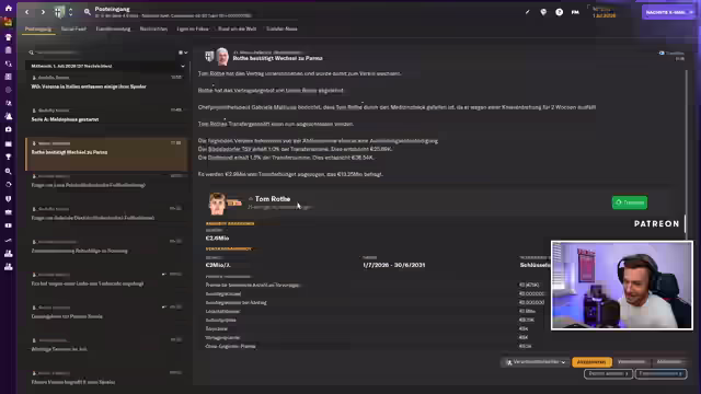00:19:22Es wird kurz über Fußball gesprochen, insbesondere über den Sieg von Freiburg gegen Basel und eine kuriose Choreo-Aktion der Baseler Ultras. Der Fokus liegt jedoch auf Parma Calcio, und es wird angekündigt, dass Scouts losgeschickt wurden, um Spieler von Union Berlin abzuwerben, da Union in die zweite Bundesliga abgestiegen ist. Konkret werden Leopold Querfeld, Aljoscha Gimlein und Tom Rote genannt, wobei letzterer eine Ausstiegsklausel von 2,6 Millionen hat. Der Streamer überlegt, ob er diesen Deal nicht machen kann, obwohl eigentlich kein Bedarf auf der Linksverteidigerposition besteht. Auch Niklas wird als möglicher Transfer in Betracht gezogen, aber es wird überlegt, ob das Geld nicht anderweitig investiert werden sollte. Es wird über das Gehaltsgefüge diskutiert und die Notwendigkeit, dieses eventuell zu sprengen, um die genannten Spieler zu verpflichten. Der Streamer äußert den Wunsch, bei Union Berlin zu wildern und fragt den Chat nach seiner Meinung.