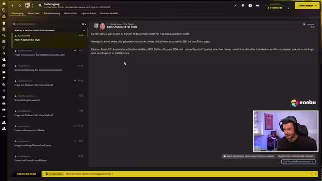 00:29:29Es wird überlegt, Lorenzo Insigne übergangsweise zu verpflichten, da man aktuell mit einer hängenden Spitze spielt. Es wird geprüft, ob dies finanziell möglich ist. Insigne soll nur für die Rückrunde kommen, um den Klassenerhalt zu sichern. Es wird überlegt, ihm einen Vertrag über fünf Monate anzubieten. Der Deal wird als gut befunden und man hofft, dass sich Insigne für Parma entscheidet. Die Verpflichtung von Insigne wird als guter Deal angesehen, um den Kader gut aufzustellen. Es wird überlegt, ob es noch geile Leihdeals gibt. Ansonsten ist man prinzipiell zufrieden mit dem Kader. Es wird überlegt, ob man noch einen von ManCity holen soll. Am Deadline Day wird nochmals nach Leihdeals geschaut, aber man ist mit dem Kader zufrieden. Der Kaderumbruch im Winter wird als gelungen bezeichnet.