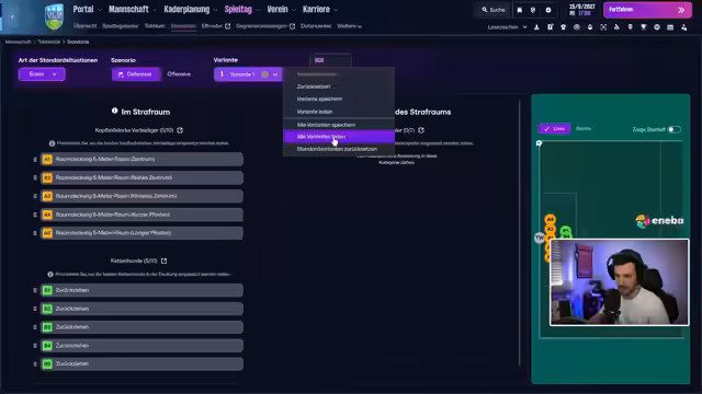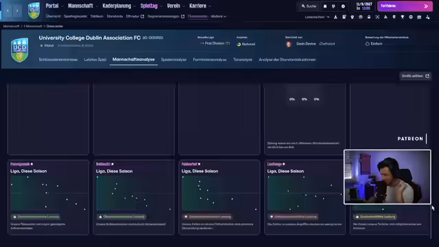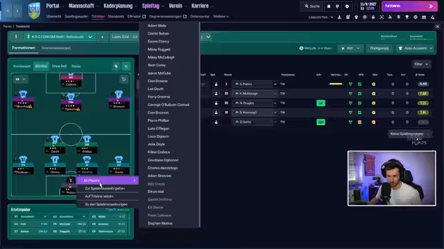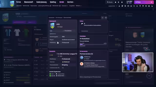 01:34:13Nach der Unterzeichnung des Vertrags bei UCD gibt es eine kurze Unterbrechung durch den Streamer. Zurückgekehrt widmet er sich den ersten Managementaufgaben. Er präsentiert den aktuellen Kader, der hauptsächlich aus jungen Spielern besteht, und weist darauf hin, dass der Verein ab sofort täglich trainieren darf. Die Medienarbeit wird an Cormac Henry delegiert, während der Streamer selbst die Bereiche Scouting, Transfers und Vertragsverhandlungen übernimmt. Das erste Ziel ist die Einstellung der Taktik.