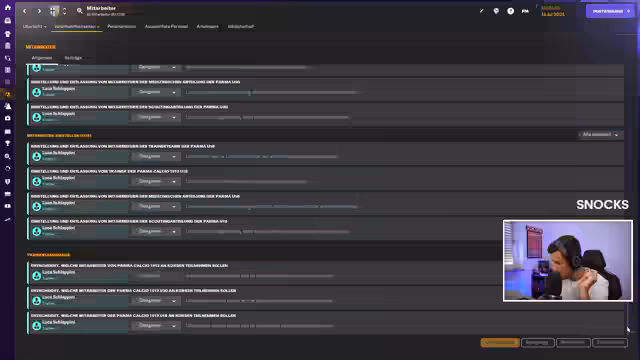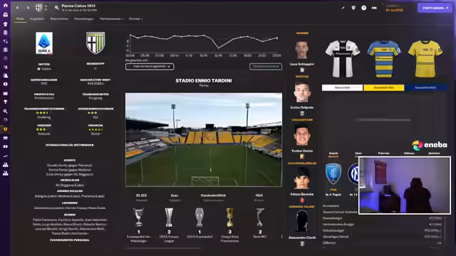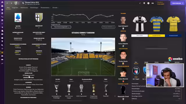 01:35:12Der Streamer erhält ein Willkommenspaket und geht die Vision und die Ziele des Vereins durch. In der letzten Saison konnte der Abstieg aus der Serie A gerade so vermieden werden. Der Co-Trainer ist Rui Salemos aus Portugal. Das Stadion wurde 1924 gebaut. Der Erzrivale ist AC Reggiana. Der Streamer ist kein Fan von Grappa. Er postet auf Insta und verlinkt Parma. Der Streamer hört sich die Hymne von Parma an. Er wird von Rodolfo, dem Pressesprecher, über Neuigkeiten aus der Fußballwelt auf dem Laufenden gehalten. Es gibt knappe halbe Million Follower auf Social Media und 7400 Dauerkartenbesitzer. Die Erwartungen sind relativ entspannt. Es soll der Klassenhalt in der Serie H erreicht werden, gegen Reggiano gewonnen werden und auf und abseits des Platzes besser werden. Es soll die Nachwuchsförderung vorangetrieben werden, die Einnahmen gesteigert und das Gehaltsbudget eingehalten werden. Ein neues Stadion wird gebaut. Der Vertrag läuft bis 2026/27. Es soll Konkurrenzfähigkeit in der Coppa Italia erreicht werden, der Klassenhalt gesichert und dann die Etablierung mehr oder weniger vorangetrieben werden. Es gelten Transferbeschränkungen für Spieler, die in dieser Saison zu Parma wechseln. Britische Spieler profitieren von einer speziellen Ausnahmeregelung.