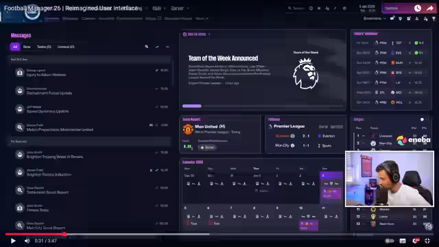 00:20:15Der Streamer leitet zum Thema Football Manager über und kündigt an, sich die FM26 News anzusehen, insbesondere das neue User Interface. Er erwähnt den offiziellen Releasetermin am 4. November und spekuliert über eine mögliche Beta-Phase zwei Wochen vorher. Er zeigt das neue FM26 Kit und ein spezielles Trainer-des-Monats-Objekt aus Polen, das er gerne selbst besitzen würde. Anschließend geht er auf YouTube, um sich das neue User Interface genauer anzusehen und die Meinungen der Community dazu einzuholen. Die ersten Reaktionen im Chat sind überwiegend positiv, wobei das übersichtliche Design und die verbesserte Benutzerfreundlichkeit gelobt werden. Er erklärt, dass das neue Design darauf abzielt, die wichtigsten Informationen stärker in den Fokus zu rücken und ein größeres Bild zu erschaffen. Er hebt hervor, wie das neue Design mit seinen Animationen und der Schriftart einen positiven Eindruck hinterlässt und die Navigation erleichtert. Abschließend erwähnt er Interviews mit Miles Jacobson, in denen dieser seine Unzufriedenheit mit dem FM25 User Interface äußerte, was zu einer Rückbesinnung auf bewährte Elemente im FM26 geführt hat.