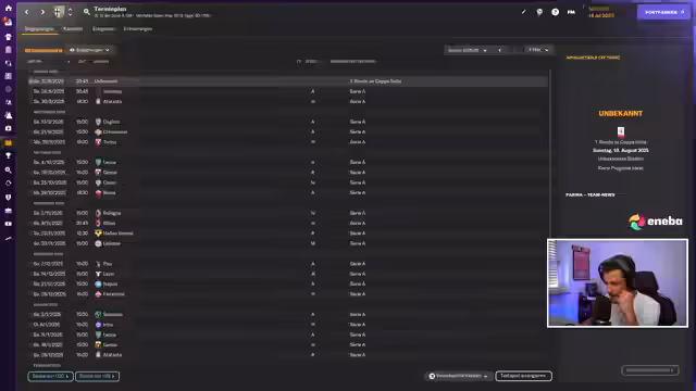 01:51:02Der Streamer bedankt sich bei Parachute für 65 Monate mit Twitch Prime. Er kündigt eine kurze Kaffeepause an und macht italienische Lieder an. Es wird überlegt, welche Taktik gespielt werden soll. Nach der Pause wird der Vergleich mit anderen Vereinen in der Liga betrachtet. Parma ist mit Elas Verona und Pisa ein absoluter Abstiegskandidat. Cagliari spielt scheinbar Europa League und Cremonense Conference League. Es wird festgestellt, dass manche Sachen falsch dargestellt sein könnten, da im Jahr 2025 gestartet wurde. Es wird ein Blick auf die Testspiele und Partnervereine geworfen. Der Streamer kündigt an, dass er sich die Einstellungen noch einmal ansehen wird.