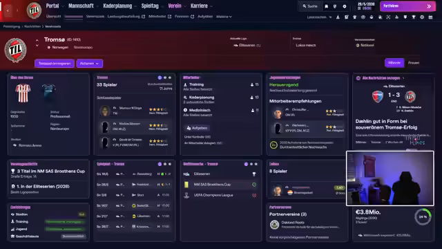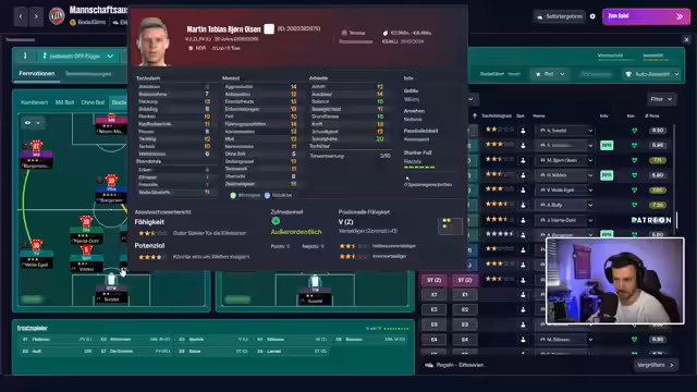 03:07:18William Hanson wird als neuer Transfer bestätigt, kommt aber erst am 1. August zum Team. Der Streamer durchsucht die Spielerdatenbank gezielt nach nordeuropäischen Talenten mit auslaufenden Verträgen, um die Mannschaft zu verstärken. Alma Bergmann wird für 160.000 verpflichtet und soll das Team ab August unterstützen. Es folgt eine Diskussion über Verkaufsstrategien für Talente wie Dahl und die Notwendigkeit, das Gehaltsgefüge anzupassen, um langfristig wettbewerbsfähig zu bleiben und junge Akteure zu halten.