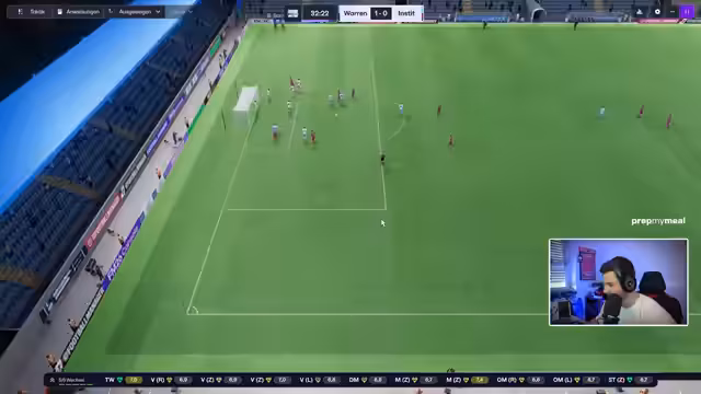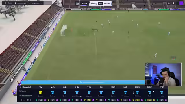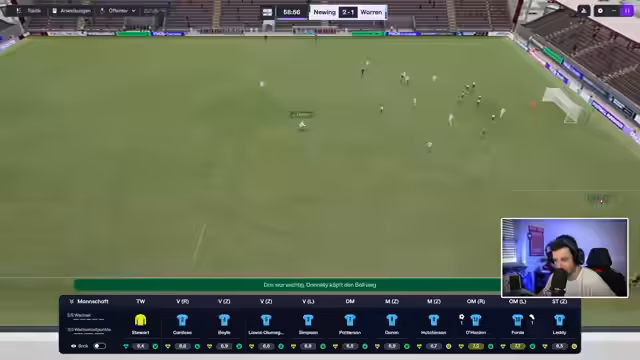 02:46:36Das Spiel ist geprägt von hoher Offensivaktivität der eigenen Mannschaft, die durch gute Laufwege und Schnittstellenpässe glänzt, es mangelt jedoch an Effektivität im Abschluss. Trotz starker statistischer Werte wie 1,3 zu 0,0 xG und einer dominanten Spielweise, wird im ersten Abschnitt das 1-1 erzielt. Der Gegentreffer fällt aus dem Nichts und tritt kurz vor der Halbzeit ein, was die Anspannung im Stadion erhöht und die fragile Situation im Abstiegskampf verdeutlicht.