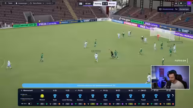 02:00:03In der Schlussphase erzielt Adam Carroll in der 89. Minute das 3:2. Warrenpoint dominiert das Spiel, kann den aber nicht über die Zeit bringen. Das Unentschieden wird letztlich als sehr hart empfunden, da die Queens University gleichzeitig gewinnt und den Abstand auf sechs Punkte vergrößert. Der Streamer betont, dass ein Sieg im direkten Duell gegen Newington für den Verbleib in der Liga absolut notwendig ist.